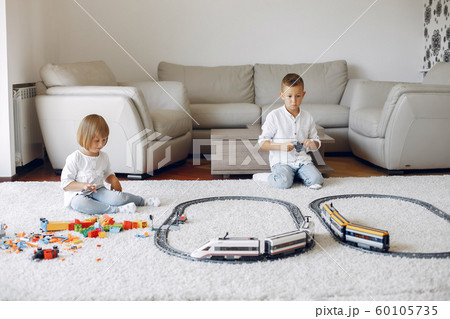 Children playing with lego and toy train in a playing room