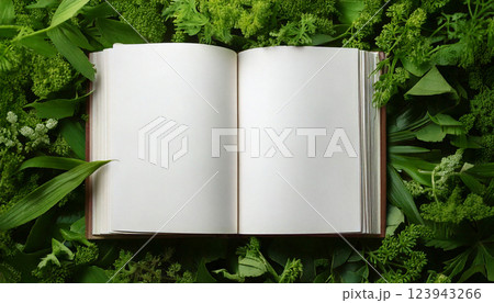 緑の植物の上に、開いた本