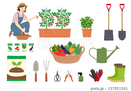 家庭菜園とガーデニングを楽しむ女性と道具のイラストセット