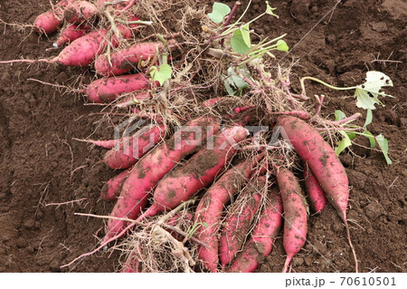 収穫したサツマイモ 掘りたての薩摩芋 サツマイモ畑 イメージ素材