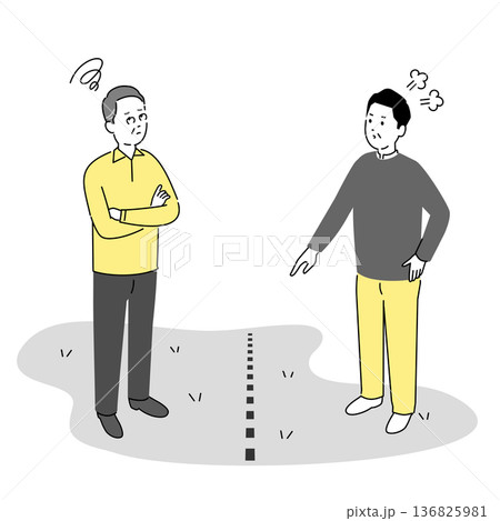 測量_土地境界トラブルイラスト 近隣住民の対立と筆界問題を表すシンプル人物ベクター