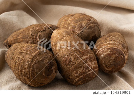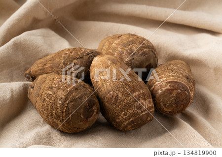 布の上に置かれた里芋(土垂)のクローズアップ