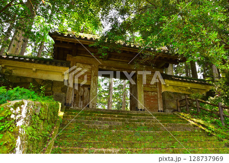 紅葉の季節に、落葉の散り敷いた廃寺の門前のイメージ