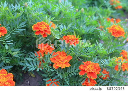 作物のコンパニオンプランツとして植えたマリーゴールド(フレンチ)花盛り、花、畑イメージ素材