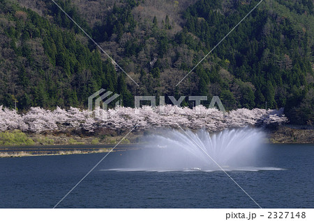 湖畔の噴水と桜
