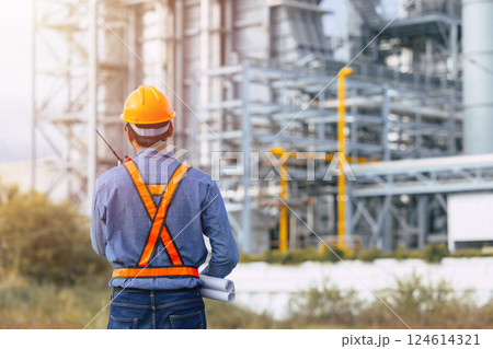 Professional Petroleum Refinery engineer man working building oil and gas power industrial plant.