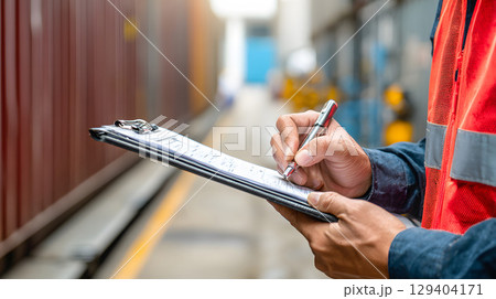 Closeup hands young engineer man and woman in suit checking train with tablet in station.