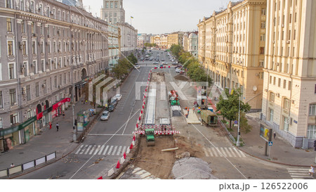 The bulldozer moves and spreads the soil and rubble on the road timelapse.