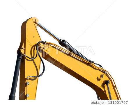 Crawler excavator with lift up bucket isolated on white background. Powerful excavator with an extended bucket close-up. Construction equipment for earthworks