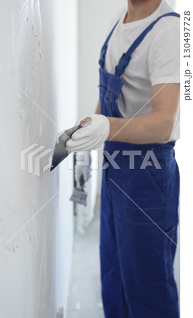 Unknown man construction worker wearing gloves and blue overalls is using a putty knife to apply plaster on a white wall, performing home renovation and improvement