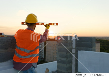 Close up of industrial bricklayer installing bricks on construction site with sunlight flare.