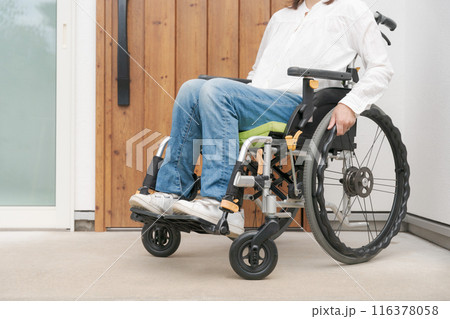 玄関の前にいる車椅子の女性
