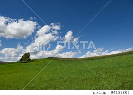 夏の北海道の草原とトウモロコシ畑と青い空に湧き上がる白い雲