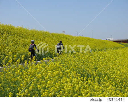 満開の菜の花咲く江戸川土手と新しくできた道風景
