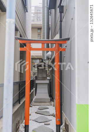 ビルの隙間に建つ小さな祠と赤い鳥居