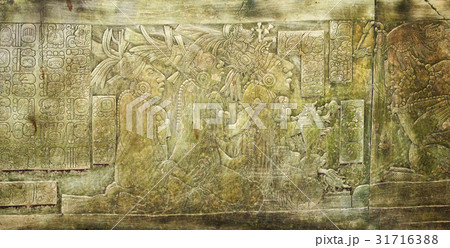 Peruvian Mayan Mask on stand in studio. Multi color. Ancient art. Studio Backdrop. Filmic lighting. Front light. Top light. Directional lighting.