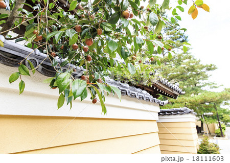 日本の風景 櫛田神社 境内の塀瓦のある土塀とノキシノブ