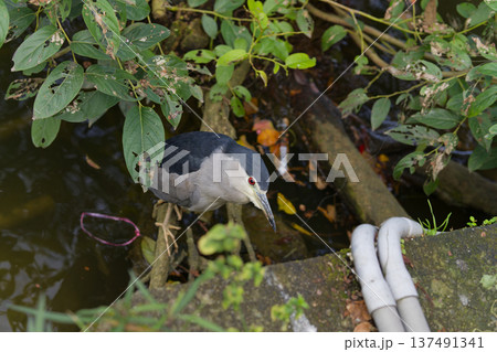 黑冠夜鷺於湖畔都市公園於台北台灣