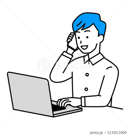 ノートパソコンを操作しながら電話するカジュアルな男性
