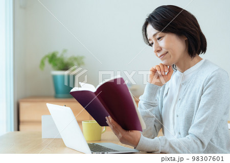 リビングでパソコンを使うミドル女性..
