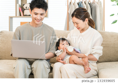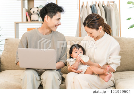 リビンングのソファーで団らんする子育て世帯のファミリー