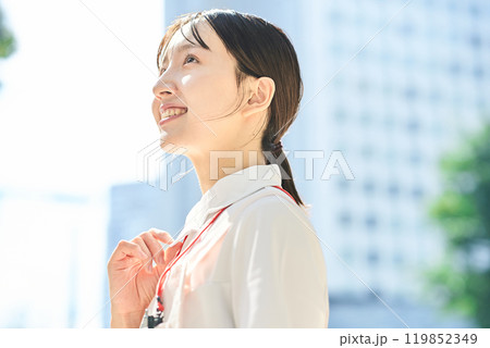 白衣とエプロンを着てスマートフォンを持つ若い女性
