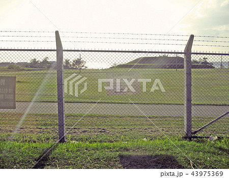 埼玉県 米軍所沢通信基地ネットフェンス門扉の警告板と青空