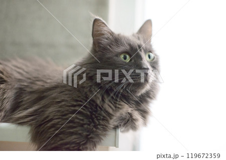 Grey Cat with Green Eyes Looking Indoors