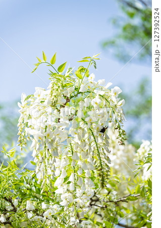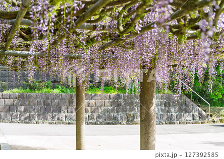青空光芒を背景に藤の花が咲き乱れる季節に映える延命水・祈願スポット!「延命地蔵尊 周辺風景」天草市