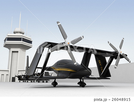 待機しているドローンタクシー。自動運転空中輸送コンセプト。