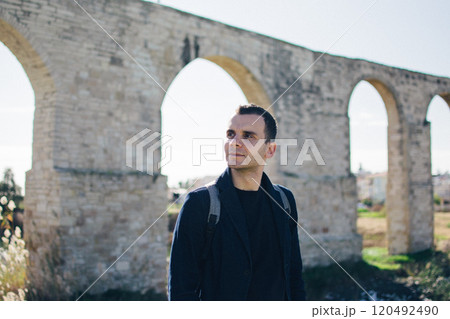 young man near the ancient Kamares Aqueduct, Larnaca, Cyprus
