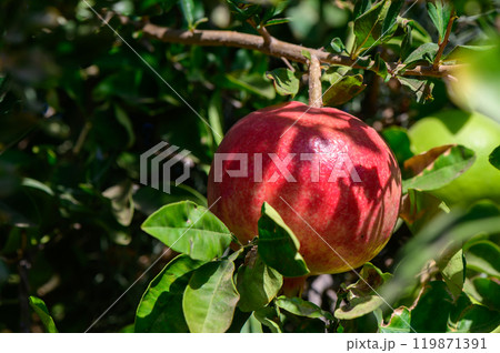 Ripening pomegranate fruit hanging from lush green branches under warm sunlight in a vibrant orchard setting