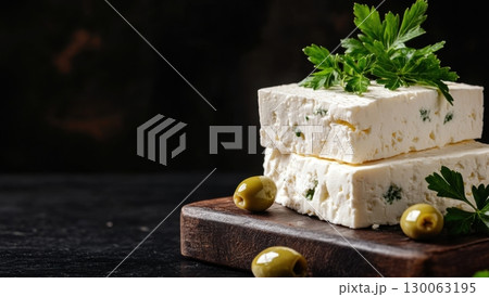Two blocks of feta cheese with herbs and olives on rustic dark background