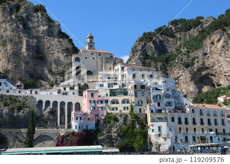 断崖絶壁が続く狭い土地に家並みが続く都市アマルフィ