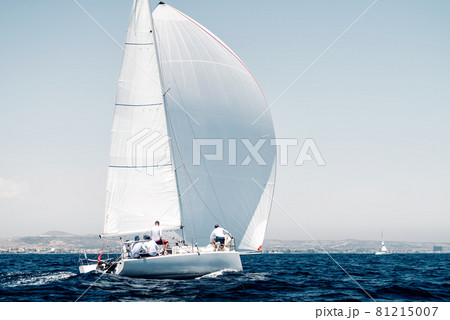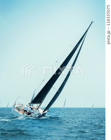 Sailboats races under blue cloudless sky. Essence of nautical spirit and teamwork