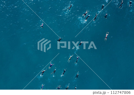 Overhead view of triathlon swimmers during competition