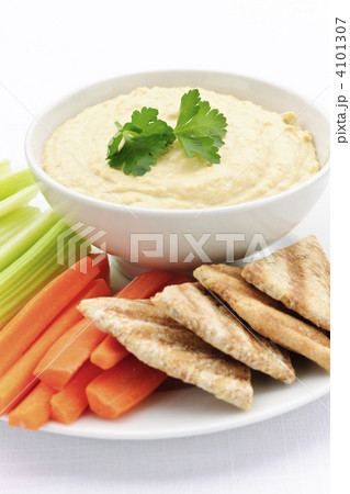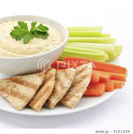 Hummus with pita bread and vegetables