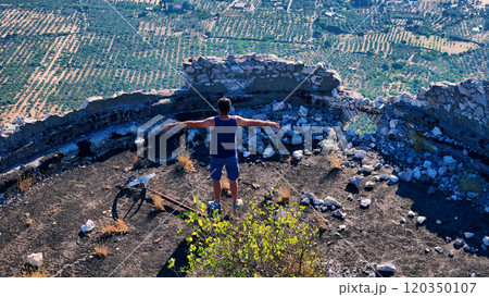 Tourist standing with open arms on ancient ruins overlooking olive tree field