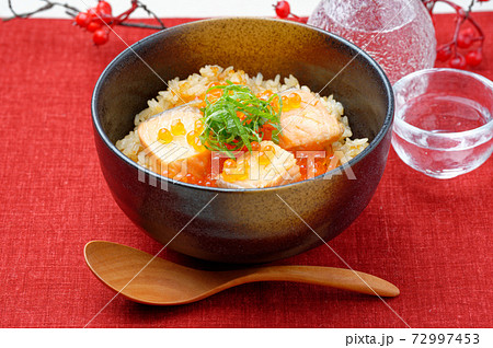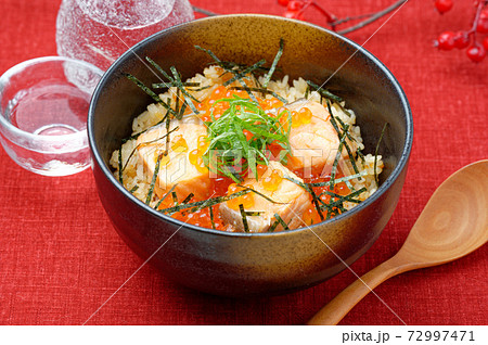 鮭(サーモン)とイクラのはらこ飯、宮城県の郷土料理。鮭の煮汁の炊き込みご飯にいくら(魚卵)乗せ。