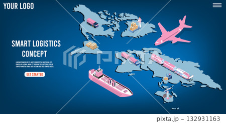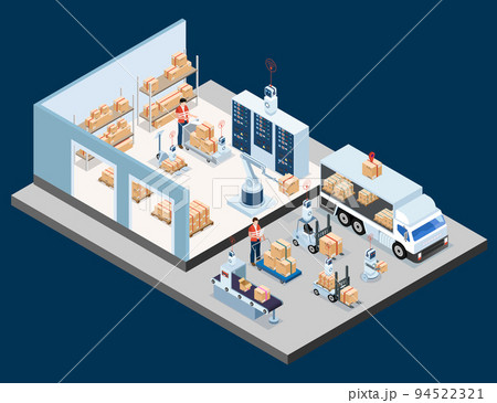 3D isometric Smart logistics concept with Warehouse Logistic, Workers loading products, transportation truck use wireless technoloty. Eps10 vector illustration