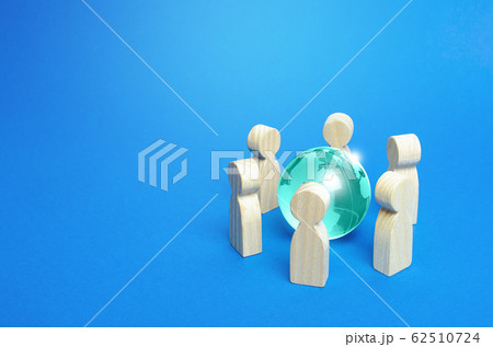 Blue earth globe is surrounded by people. Global communication, cooperation and collaboration. Diplomacy and negotiation process. Access to the World Wide Web. Consolidation in solving global problems