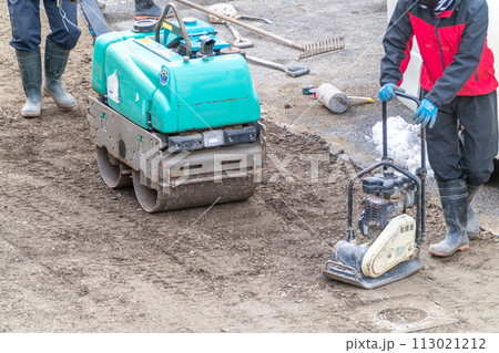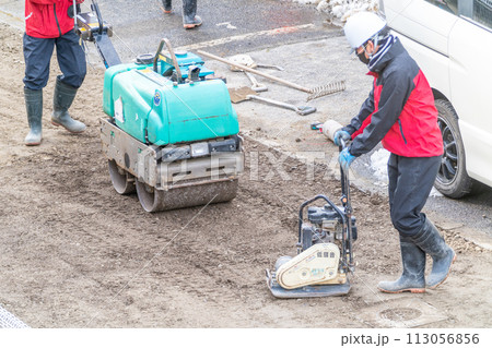 道路工事 振動ローラー プレートコンパクター 転圧作業