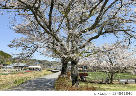 満開の桜と道の駅原尻の滝