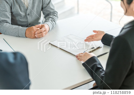シニア男性をカウンセリング・案内・紹介するスーツ姿の女性ビジネスウーマンの手元
