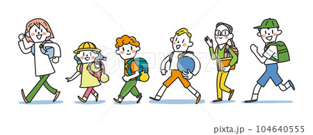 1年生から6年生の元気な小学生と通学路 セット イラスト素材