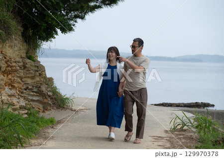 海岸沿いを歩く夫婦の後ろ姿