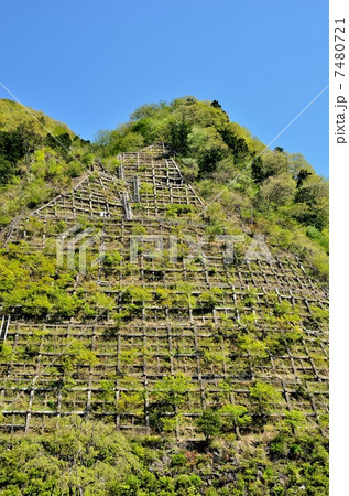 静岡県周智郡森町の風景(かわせみ湖に整備された格子状擁壁)