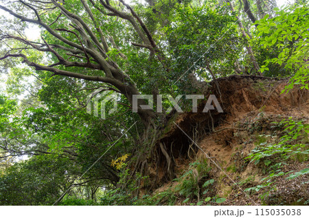 雨で土砂が流れ出してしまい倒れそうな森の木
