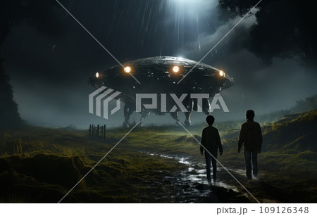 Two people are looking at an alien ship in a field