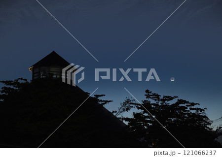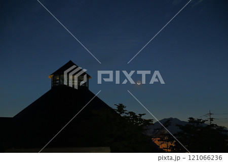 北杜市白州町、夜明けの空に昇る神無月一日の有明の月、地球照の細い月